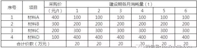 某項(xiàng)目的建設(shè)期6個月,合同約定進(jìn)度款40萬元/月(不含稅價格)。施工中,甲施工單位共采購了4種建筑材料,材料價格(不含稅價格)及各月消耗量見下表。