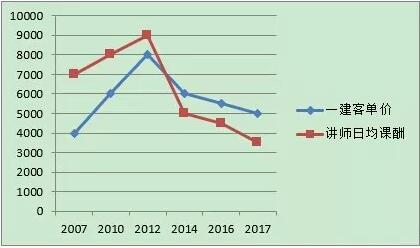 先說講師、培訓機構及考生雙方的議價能力。我經常給人打趣說,建筑培訓行業是一幫子窮人在為一幫子有錢人服務,還經常被克扣薪水。這個行業的考生本來是收入不錯的群體,考試通過后企業的獎勵也比較客觀,持證上崗后對本人和企業都有非常大的利好。從支付意愿到支付能力都很好,就是生生變成了對價格敏感性的消費者。魯班培訓統計過建造師客單價變化曲線,不考慮物價上漲指數,自2005年到2017年基本上是正態分布。高點是在2012年左右,一建全科8000元左右。此后就逐步下降,目前大概是一建全科6000元左右。這個結果無論是同行競爭導致的競相降價,還是考生貨比三家懂得了殺價,抑或是企業內訓帶來的總體客單價下降,不管怎么說,最后落到講師和培訓機構口袋里的錢變少了。講師的講課費變化曲線與客單價高度吻合,也是顯著的正態分布。目前,一建的一線講師精講課每天能拿到8000元算是不錯了,而5000元已經成為常態;而二類講師的行情基本上落到了三四千元的樣子,基本上接近財會、醫藥和司法考試行業成熟期的授課費水準(圖5)。