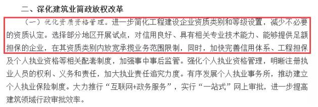2017年2月24日,國務(wù)院辦公廳下發(fā)《關(guān)于促進(jìn)建筑業(yè)持續(xù)健康發(fā)展的意見》(國辦發(fā)〔2017〕19號(hào)),將“優(yōu)化資質(zhì)資格管理”作為首要事項(xiàng),放在文件“深化建筑業(yè)簡政放權(quán)改革”的第一條,足見重視程度。