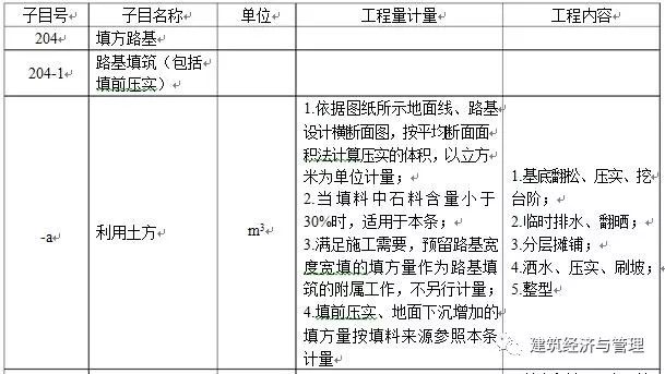 標準文件2018的工程量清單由子目號、子目名稱、單位、數量、單價、合價組成。工程量清單計量規則也由子目號、子目名稱、單位、工程量計量、工程內容組成。這樣每個子目號與工程量清單的子目號一一對應,是承包人報價、發包人支付的依據。例如工程量清單計量規則204-1 路基填筑(包括填前壓實),摘錄如下