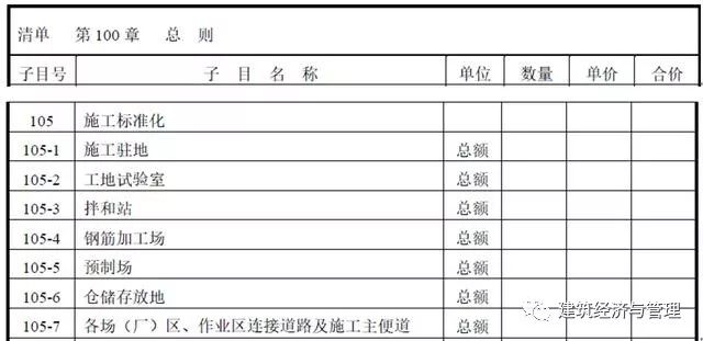 隨著最近幾年我國建設工程規模的擴大以及國家對建設工程整個行業要求越來越高,公路工程施工標準化建設也被提出了很高的要求。2018標準文件對承包人的駐地建設,生活、辦公、居住條件均做了明確標準要求,工地試驗室根據工程的內容和規模,對各功能室的面積大小做了要求。攪拌站、鋼筋加工場、預制場、倉儲存放地要求全部工廠化、集約化的集中建設,按標準化、規范化、精細化的要求組織施工。這些標準化建設的施工場地均對規模和標準做了要求。對施工便道的技術等級標準也做了明確規定。所以2018標準文件工程量清單在100章中專門增加了施工標準化一節,第105節,增加專項費用,強化標準化施工管理,增加項目具體見下表。