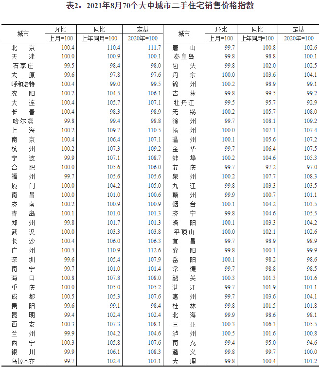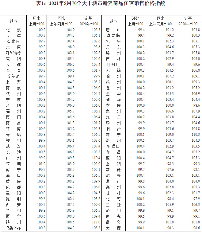 日前,國家統(tǒng)計局發(fā)布2021年8月份70個大中城市商品住宅銷售價格變動情況。國家統(tǒng)計局城市司首席統(tǒng)計師繩國慶表示,2021年8月份,各地全面落實房地產(chǎn)長效機制,持續(xù)加強房地產(chǎn)市場調(diào)控,70個大中城市商品住宅銷售價格環(huán)比、同比漲幅總體延續(xù)回落態(tài)勢。