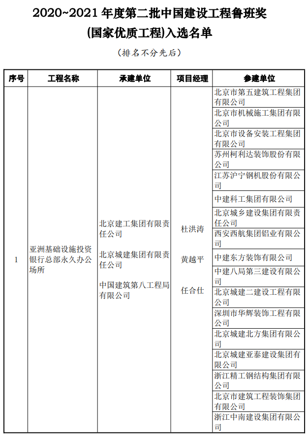 2020~2021年度第二批中國建設(shè)工程魯班獎(國家優(yōu)質(zhì)工程)申報、復(fù)查、評審、審定工作已結(jié)束,根據(jù)《中國建設(shè)工程魯班獎評選辦法(2021年修訂)》有關(guān)規(guī)定,現(xiàn)將入選工程名單公示,公示時間為2021年11月24日至11月30日。如對公示工程有異議,請于公示期內(nèi)向我會反映,反映的內(nèi)容應(yīng)實事求是。以單位名義反映情況的材料應(yīng)加蓋單位公章,以個人名義反映情況的材料應(yīng)署實名并提供聯(lián)系電話。
