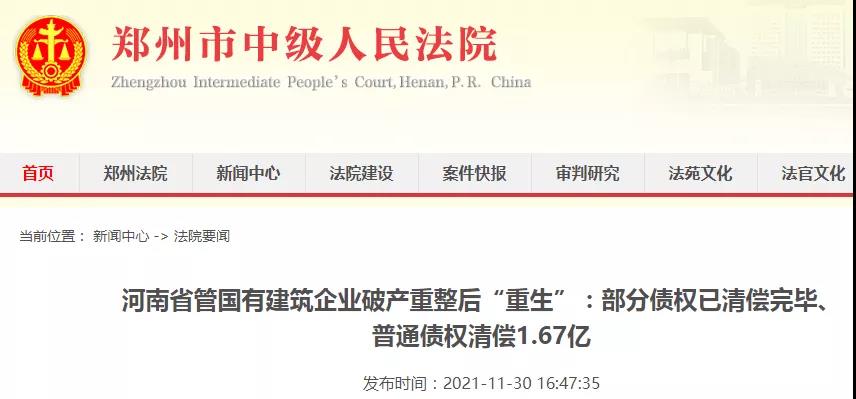 近日,鄭州市中級(jí)人民法院發(fā)布一則要聞。河南省管國有建筑企業(yè)破產(chǎn)重整后“重生”:部分債權(quán)已清償完畢、普通債權(quán)清償1.67億!