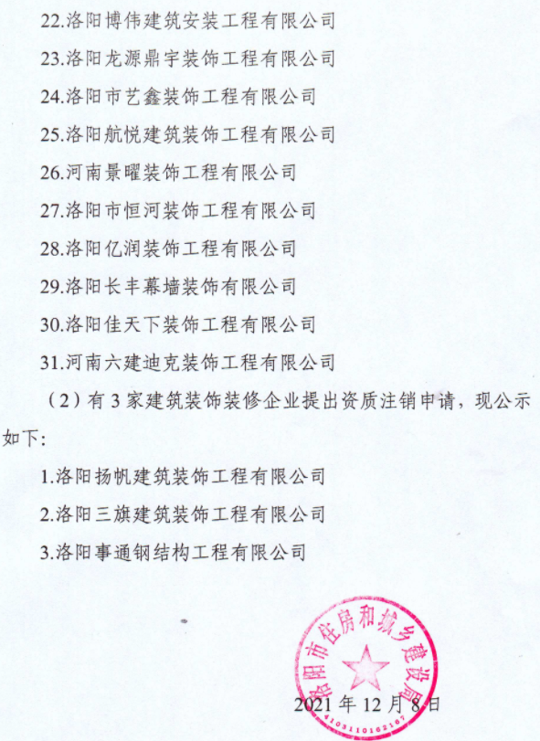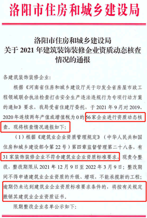 近日,洛陽市住建局發(fā)布了關于2021年建筑裝飾裝修企業(yè)資質動態(tài)核查情況的通報。