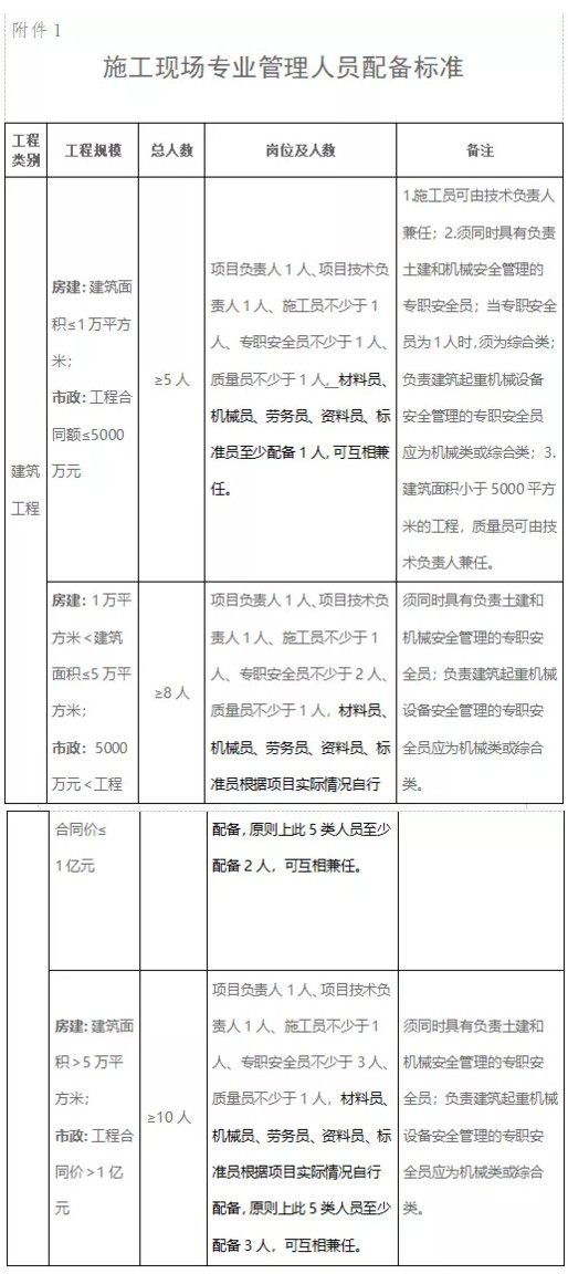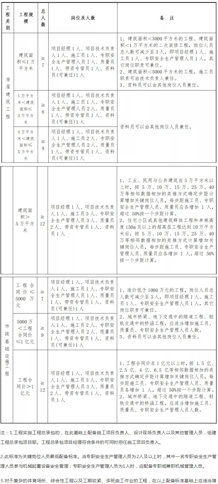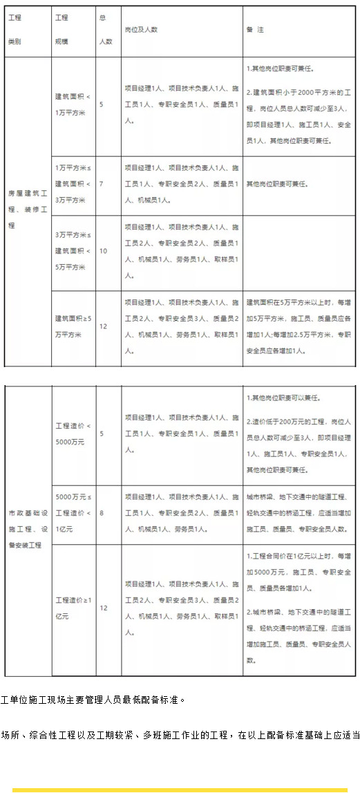 注:1.此標(biāo)準(zhǔn)為施工現(xiàn)場(chǎng)專業(yè)管理人員最低配備標(biāo)準(zhǔn),施工企業(yè)應(yīng)當(dāng)根據(jù)工程項(xiàng)目施工實(shí)際工作需要配備人員。