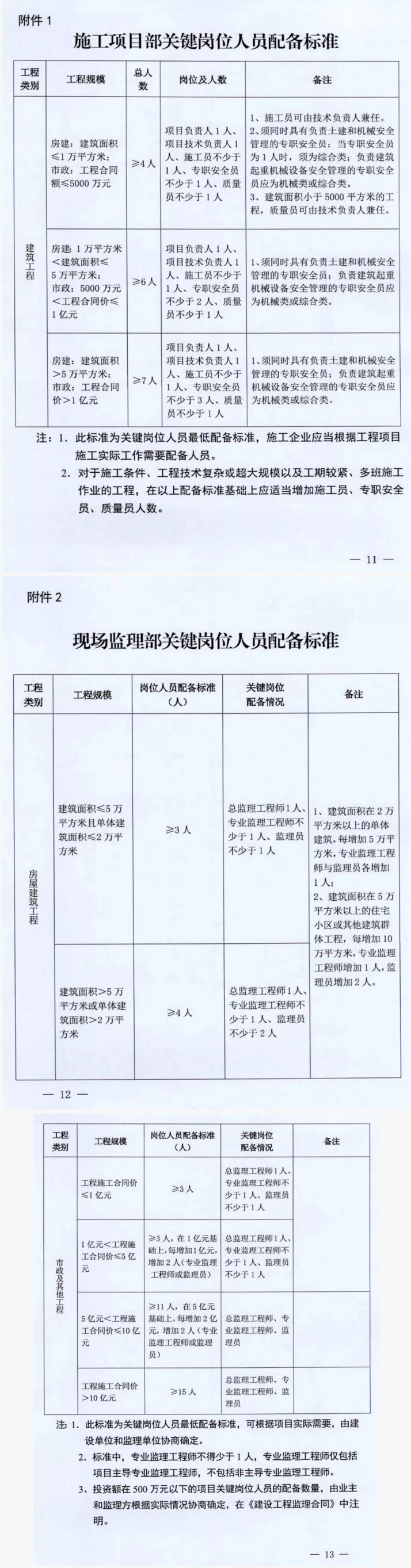對(duì)施工項(xiàng)目部、現(xiàn)場(chǎng)監(jiān)理部關(guān)鍵崗位人員數(shù)量進(jìn)行優(yōu)化縮減,僅規(guī)定不同規(guī)模最低崗位數(shù)量。