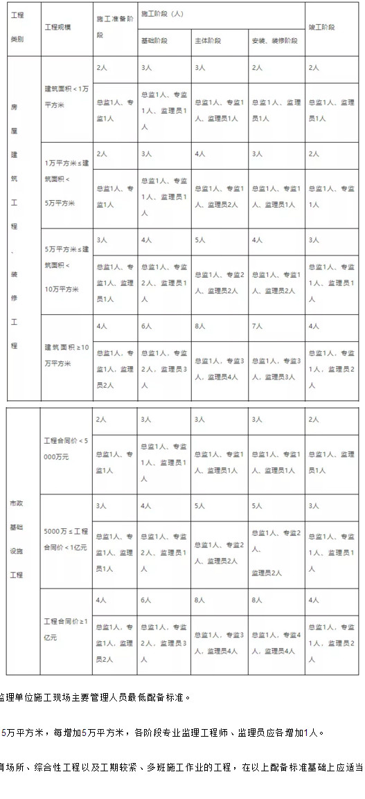 注:1.此標(biāo)準(zhǔn)為關(guān)鍵崗位人員最低配備標(biāo)準(zhǔn)。監(jiān)理單位可以任命專業(yè)監(jiān)理工程師或監(jiān)理員兼職負(fù)責(zé)安全監(jiān)理、測(cè)量復(fù)核和見(jiàn)證取樣工作。