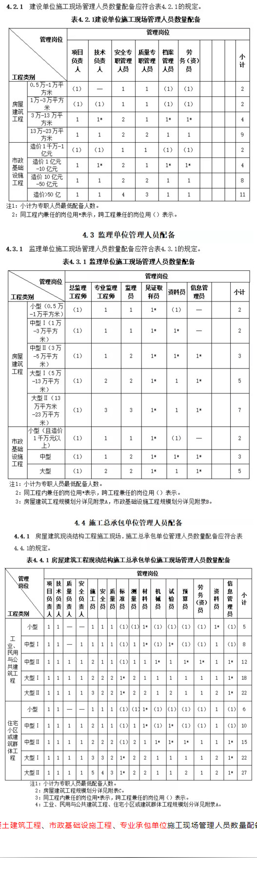 3.對(duì)于復(fù)雜的體育場(chǎng)所、綜合性工程以及工期較緊、多班施工作業(yè)的工程,在以上配備標(biāo)準(zhǔn)基礎(chǔ)上應(yīng)適當(dāng)增加施工員、質(zhì)量員、專職安全生產(chǎn)管理人員人數(shù)。