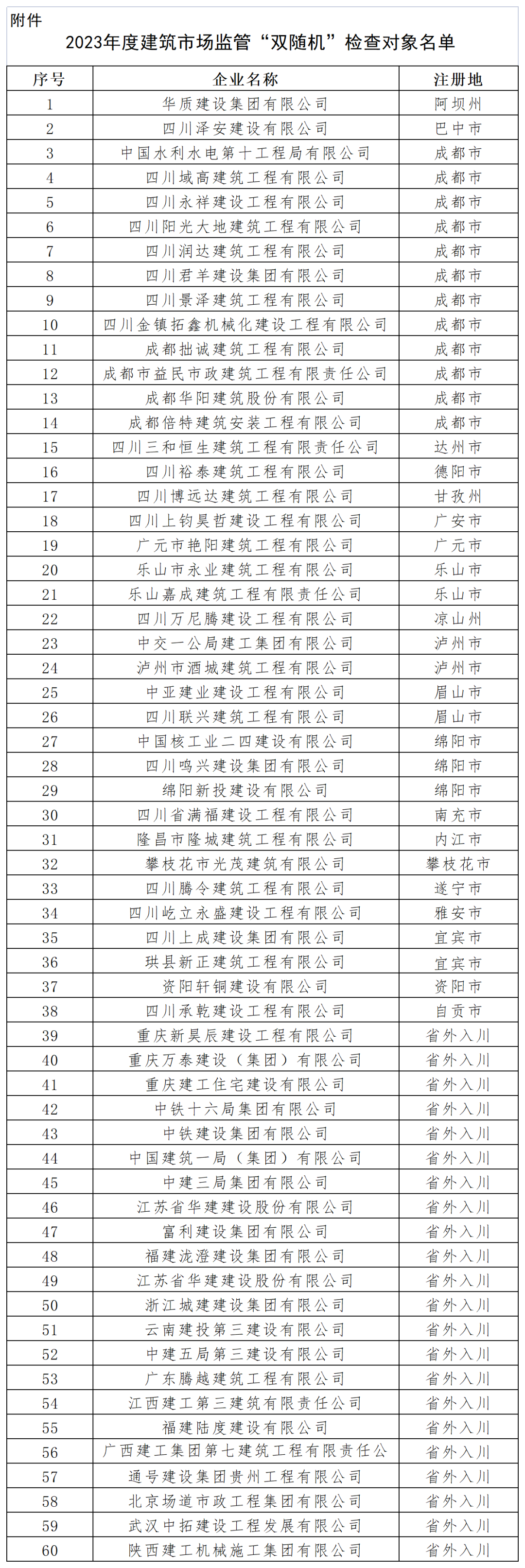 四川省住房和城鄉建設廳關于公布2023年度建筑市場監管“雙隨機”檢查對象名單的通知