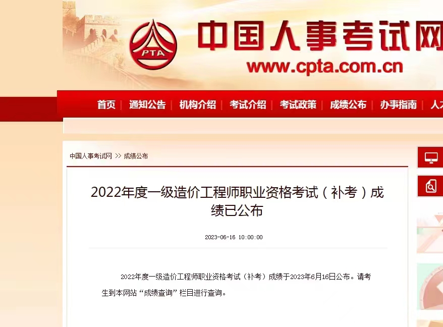 2022年度一級造價(jià)工程師職業(yè)資格考試(補(bǔ)考)成績于2023年6月16日公布。請考生到中國人事考試網(wǎng)站(http://www.cpta.com.cn/)點(diǎn)擊“成績查詢”欄目進(jìn)行查詢。