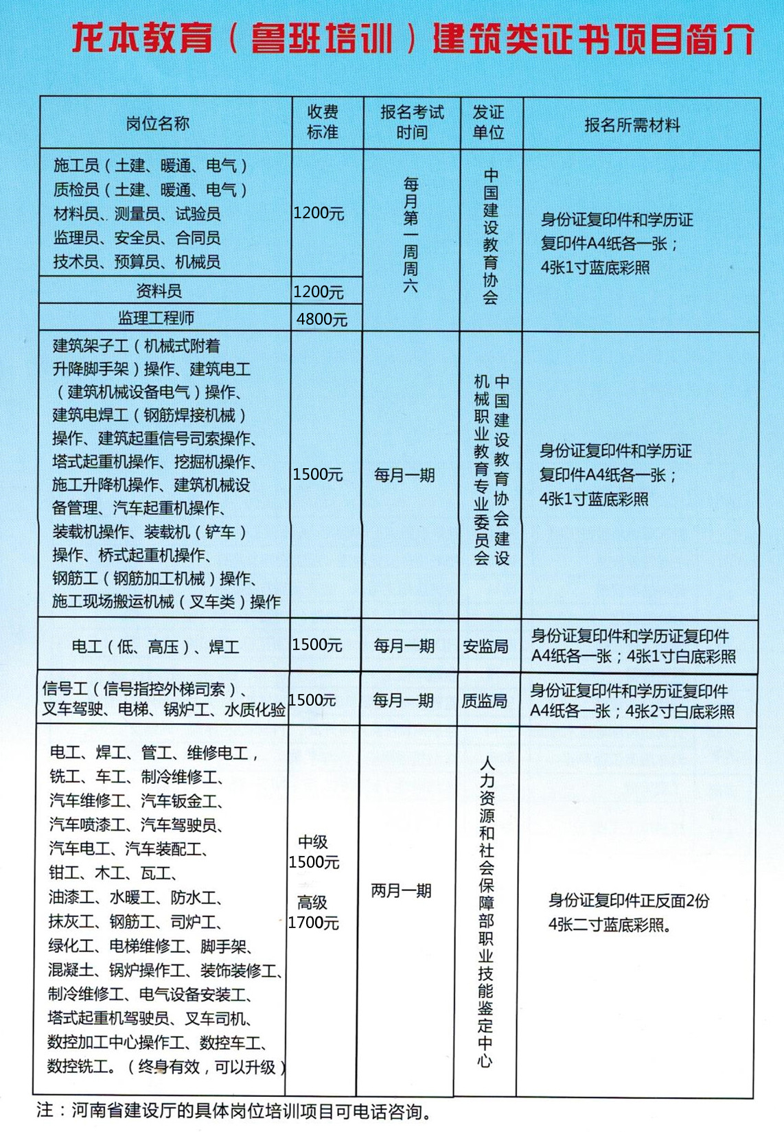 魯班培訓河南分校主營:一級建造師培訓、二級建造師培訓;BIM培訓;消防工程師培訓;造價工程師;監(jiān)理工程師;安全工程師等建筑人才及企業(yè)人才培訓;建筑學歷(鄭州大學、電大等);證書代注冊;技工證;八大員;中級職稱代評等。